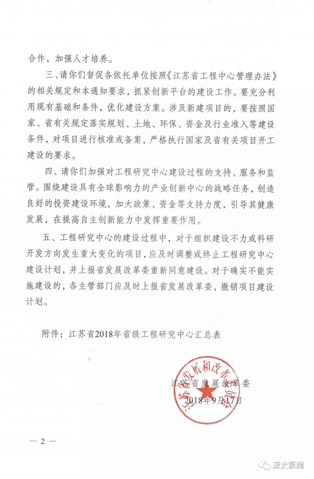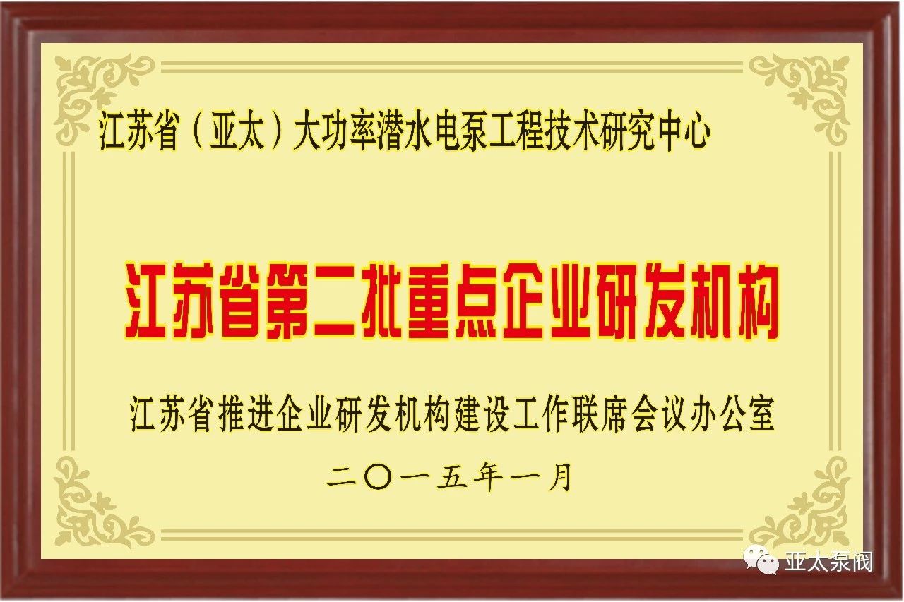 近日,省发改委正式发文,同意建设2018年度省级工程研究中心,旺财28泵阀有限公司申报的省级创新平台江苏省特大型潜水电泵及泵站系统工程研究中心成功获批,成为我省水泵行业唯 一入选企业。